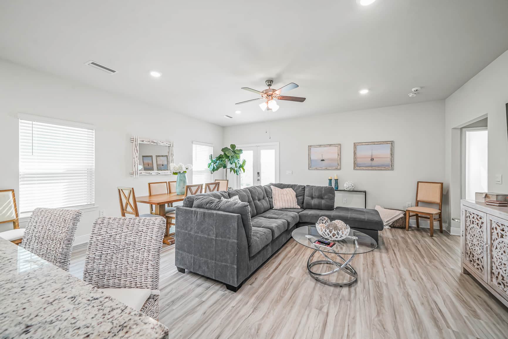 Unwind in the comfortable living room, featuring a plush sectional sofa and a 75-inch Roku Smart TV for movie nights, game days, or streaming your favorite shows. Coastal-inspired décor, soft lighting, and natural textures create an easygoing beach vibe that instantly feels like home.