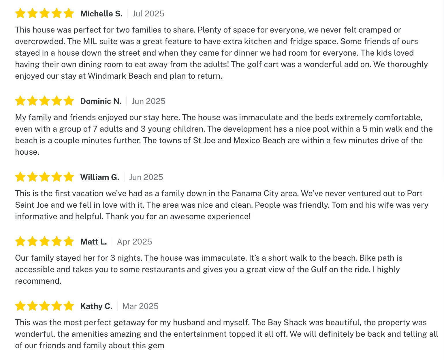 In 2025, The Bay Shack earned nine glowing 5-star reviews from happy guests—and their feedback says it all. Our guests consistently rave about how the relaxing and clean the home is and what a great location within WindMark Beach.